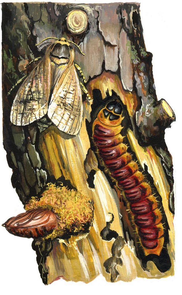 ist ein großer Nachtfalter, der im Juni/Juli fliegt. Er legt seine Eier auf die Borke (höchstens bis zur Brusthöhe) an den unteren Teilen der Stämme von Apfel- und Birnbäumen. Die ausschlüpfenden Raupen leben zuerst gesellig unter der Rinde. Im zweiten Jahr gehen sie tiefer in das Holz, das sie nach allen Richtungen hin durchbohren. In diesen Gängen überwintern sie. Kot und Bohrspäne werden aus der am unteren Ende des Ganges befindlichen Öffnung ausgestoßen. Am Ende der Öffnung verpuppen sich die Raupen nach 3 bis 4 Jahren in einem mit Bohrspänen untermischten Gespinst, aber auch in der Erde. Vor dem Ausschlüpfen des Falters schiebt sich die Puppe aus dem Gespinst hervor.
